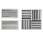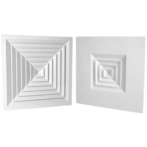Diffusore quadrato da soffitto a 4 direzioni di lancio su pannello 595×595 in alluminio bianco.