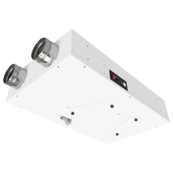 EVOLVO TER è un’unità di ventilazione con recuperatore di calore controcorrente, in polipropilene con efficienza > 90%, con scambiatore sensibile ed attacchi laterali.