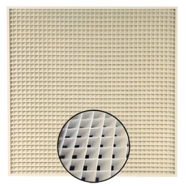 Griglia di ripresa 600×600 mm a maglia inclinata per controsoffitti modulari.