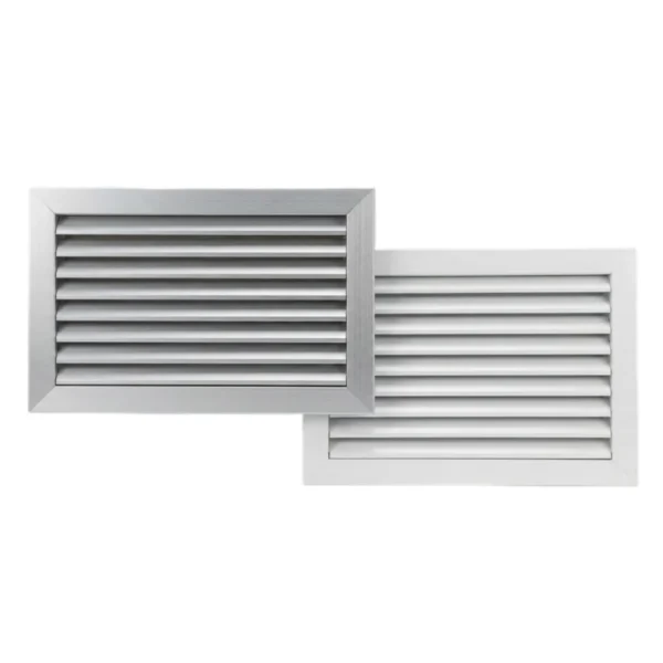 Griglia di ripresa in alluminio con rete e tegolo ad alette fisse passo 20 mm. Colorazione Alluminio.